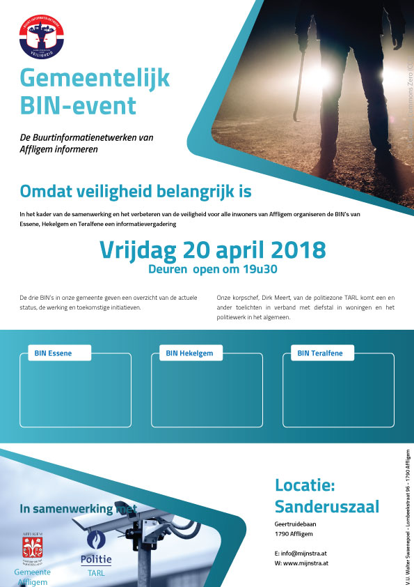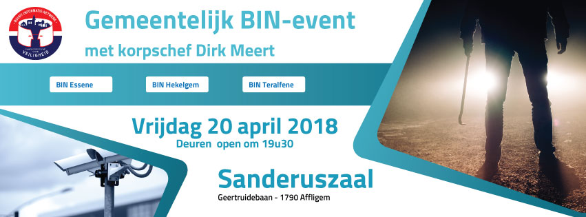 Op vrijdag 20 april organiseren de drie BIN's van Affligem een eerste gemeentelijk BIN-event. Tijdens deze avond wordt een korte stand van zaken gegeven van de drie BIN's, gevolgd door een uiteenzetting van TARL-korpschef Dirk Meert. Plaats van het gebeuren is de Sanderuszaal. De deuren gaan open om 19u30 en we starten ermee om 20u.